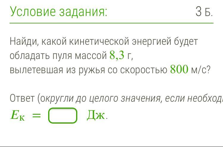 Найди, какой кинетической энергией будет обладать пуля массой 8,3 г,