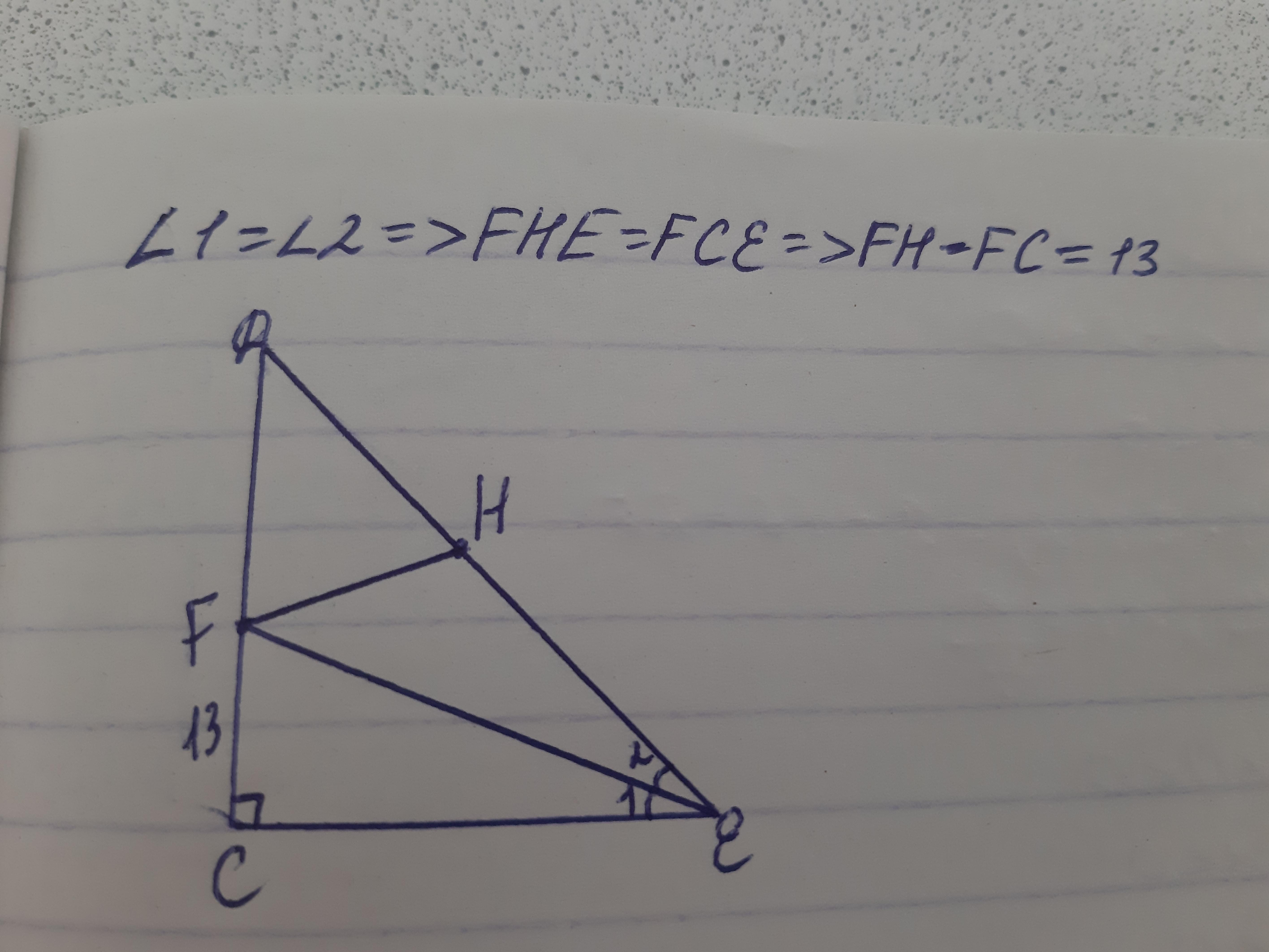EF- биссектриса следовательно угол 1 = углу 2=>FHE= FCE(по острому углу)=> FH=FC=13