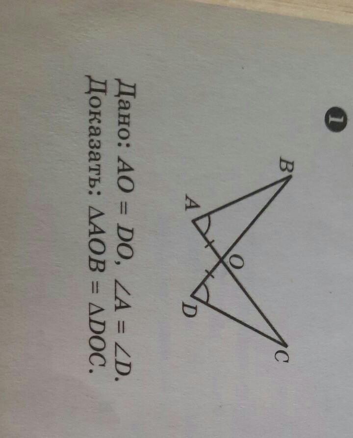 угол А=углуД, АО=ДО по условию задачи. угол ВОА= углу СОД, как вертикальные. отсюда следует, что треугольник АОВ=треугольнику ДОС по второму признаку.