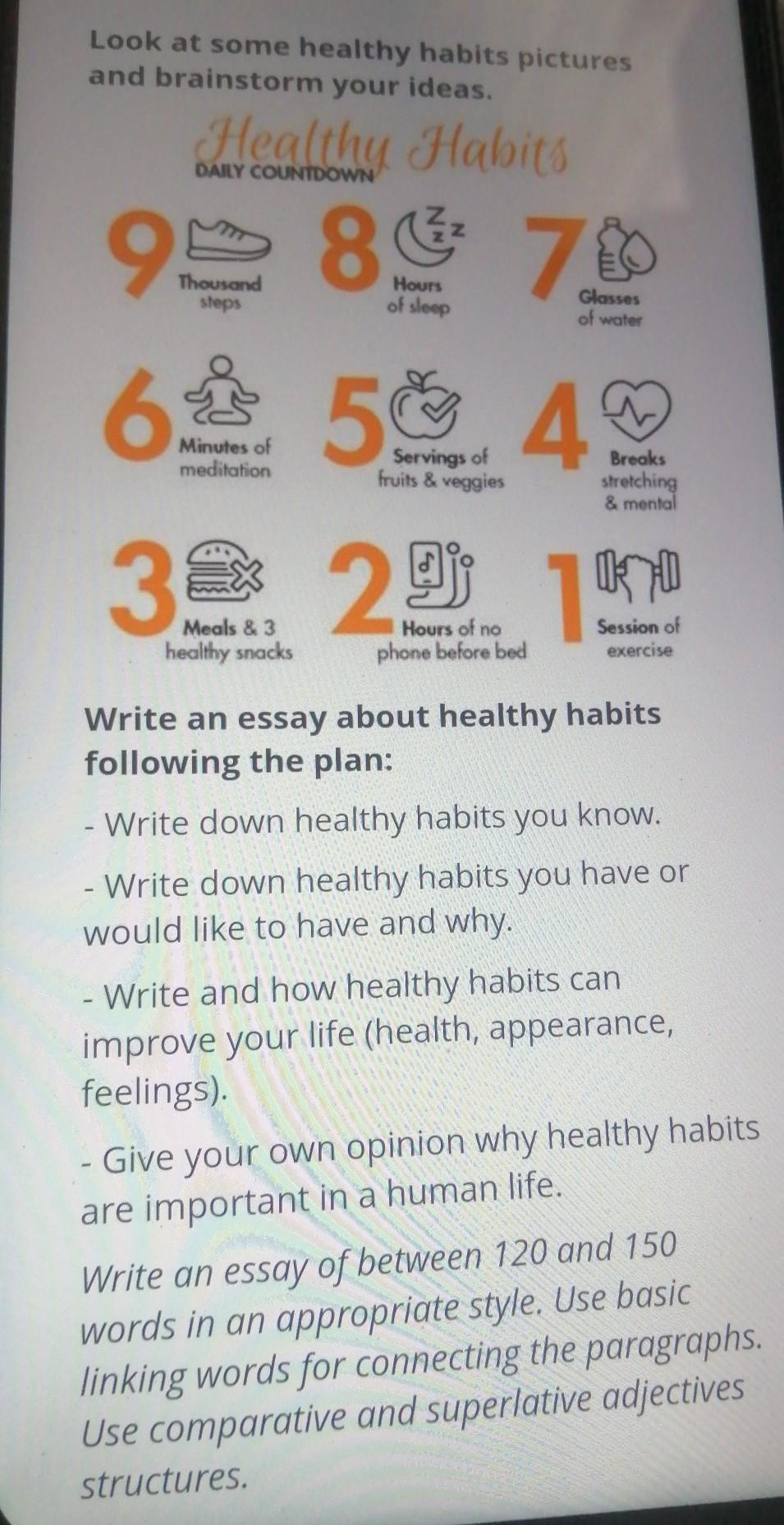 There are so many healthy habits in the world that can affect your life in a good way. For example, drinking a lot of water is a very good habit, just as good as playing sports, running, and strength training. I have a habit of cycling and drinking a lot of water in a day. I would like to have a habit of doing sports in the morning. Because it will help improve your health. Healthy habits improve our lives in different ways. For example, if you go in for sports, your body will be more toned, if you eat right, your face will improve, as will your body and senses. Because if a person wakes up late, eat fast food, do not drink water, do not engage in power loads.He can get fat, it will be very hard and bad for him. If you do not already say how he feels. Healthy vaccinations are very important to our life!