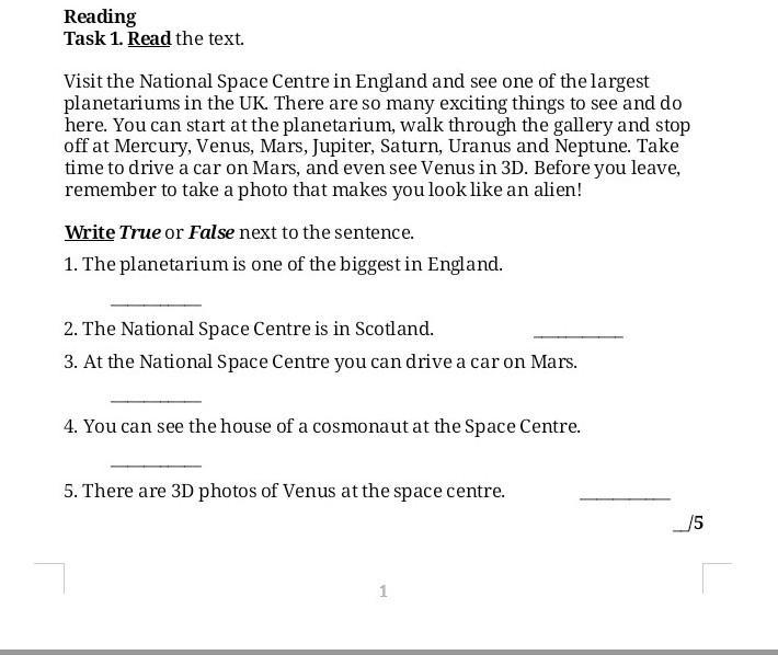 Task 1. Read the text. visit the National Space Center in England and see one of the largest planetariums in the UK. there are so many interesting things to see and do here. you can start at the planetarium, walk through the gallery, and stop at Mercury, Venus, Mars, Jupiter, Saturn, Uranus, and Neptune. Take the time to take a car ride around Mars and even see Venus in 3D. Before you leave, don't forget to take a photo that will make you look like an alien!