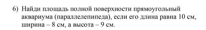 S пов акв = P H + a b = 2 (10 + 8)*9 + 10 * 8 = 324 + 80 = 404 ( см² ) .