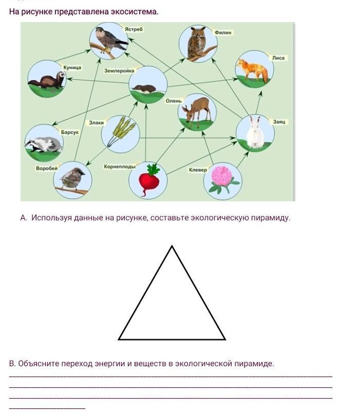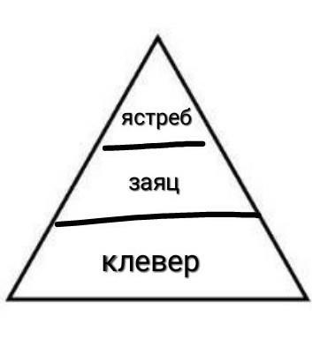 Мы имеем 10000 кг клевера, этим клевером накормим в 10 раз меньше зайцев, то есть 1000 кг массы зайцев. Тогда этой массой зайцев можно накормить только 100 кг массы ястребов.