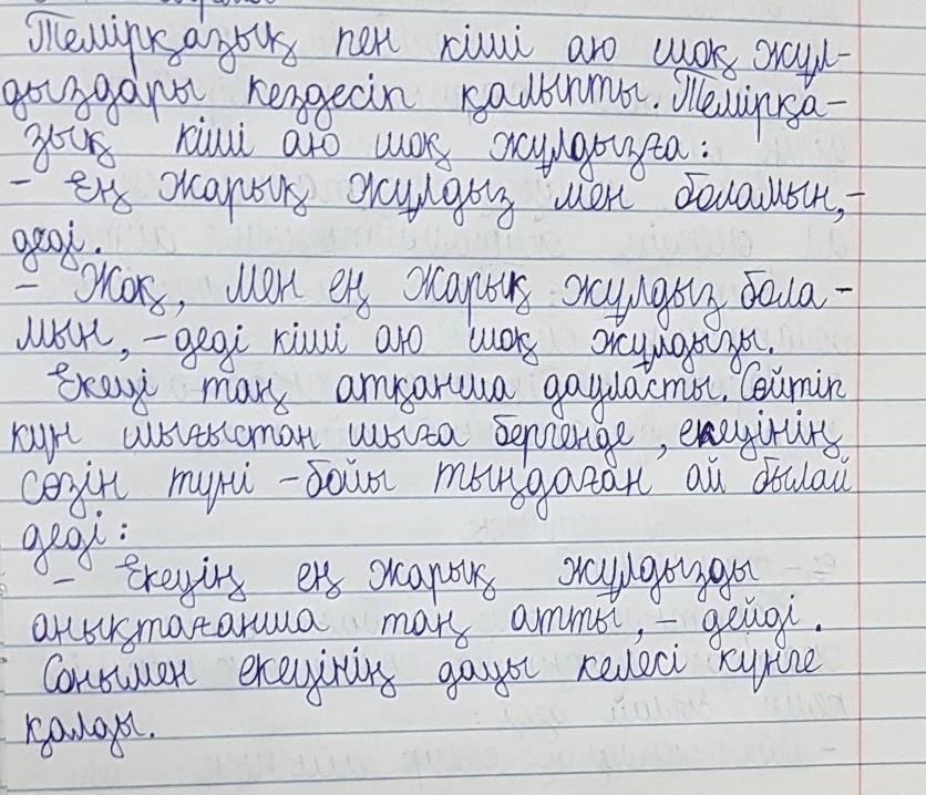 3)Аспанда Жеті қарақшы жұлдызы, темір қазық жұлдызы , кіші аю жұлдызы бар.Жұлдыздар газдан тұрады.Өте қушті қызған кезде олар жарық шығарады.