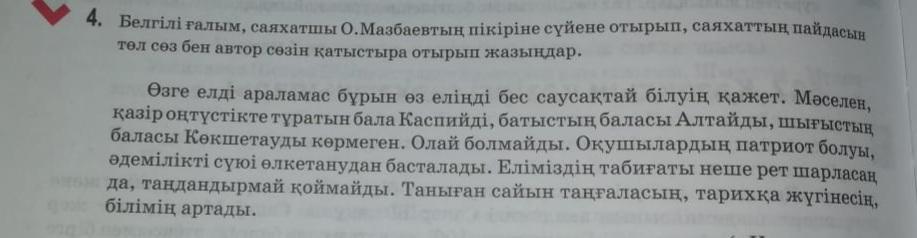 Менің ойымша О.Мазбаевтың пікірі өте дұрыс.Қазіргі заманда адамдар тіпті өзінің туылған жерін танымай бара жатыр.Ол дұрыс емес деп есептеймін.Мейлі,сен ол жерге өз көзіңмен көріп,бармасаңда менің ойымша сол жердің тіпті атын білу керек деп ойлаймын