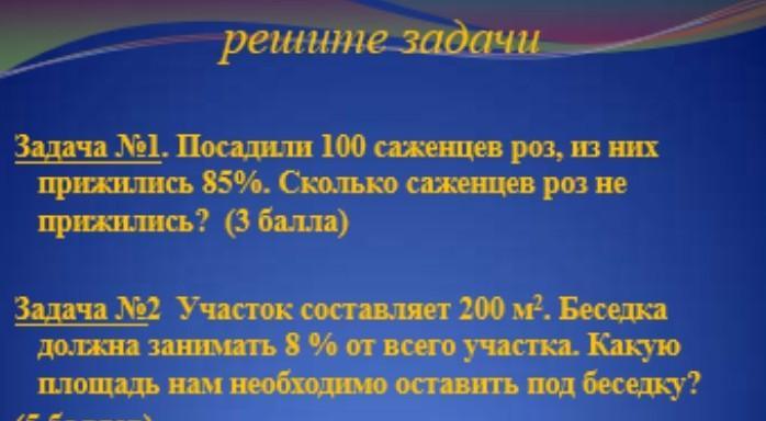 Сначала делим количество саженцев роз на 100%, чтобы узнать сколько саженцев в одном проценте