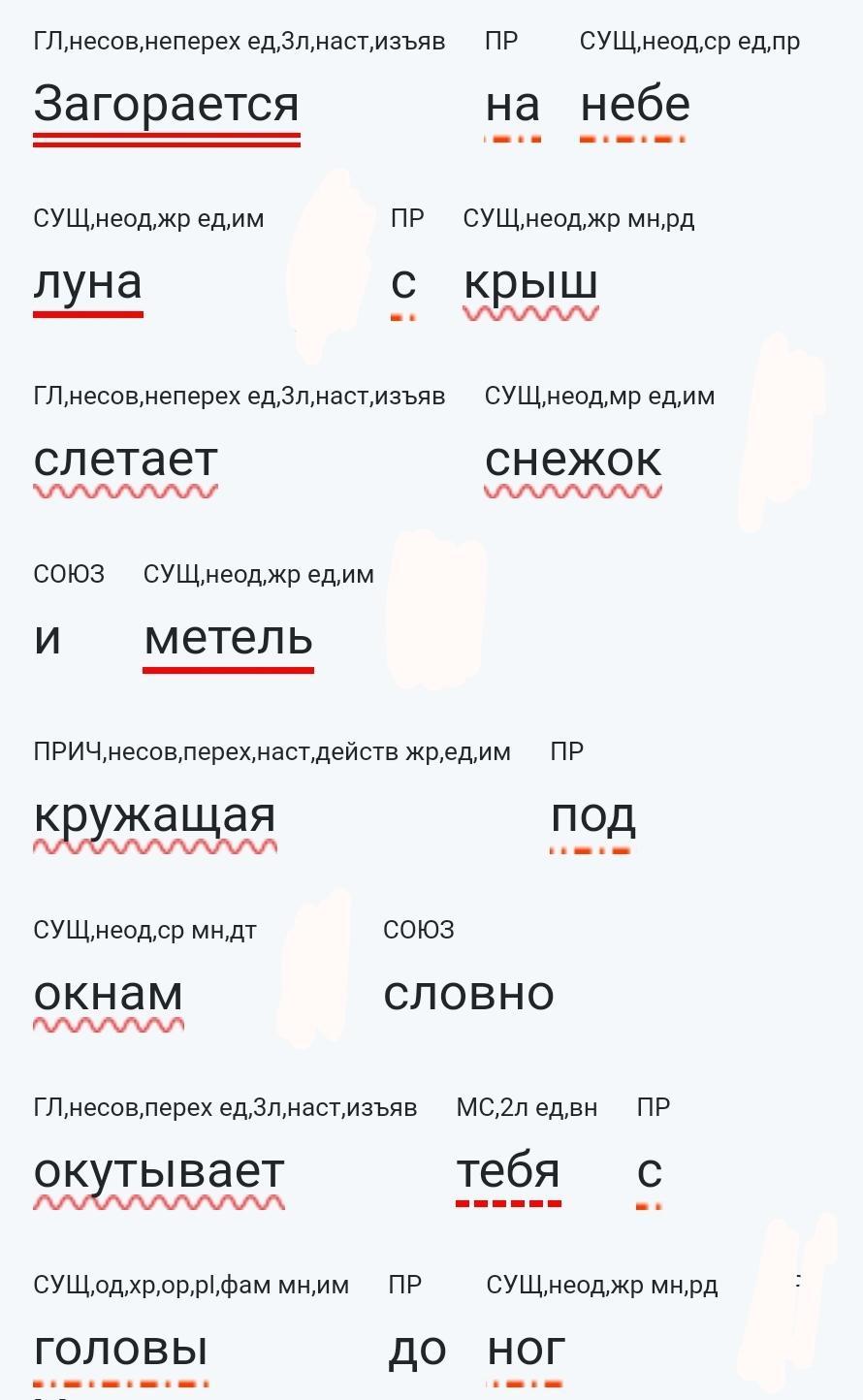 4. Синтаксический разбор предложения: Загорается на небе луна, с крыш