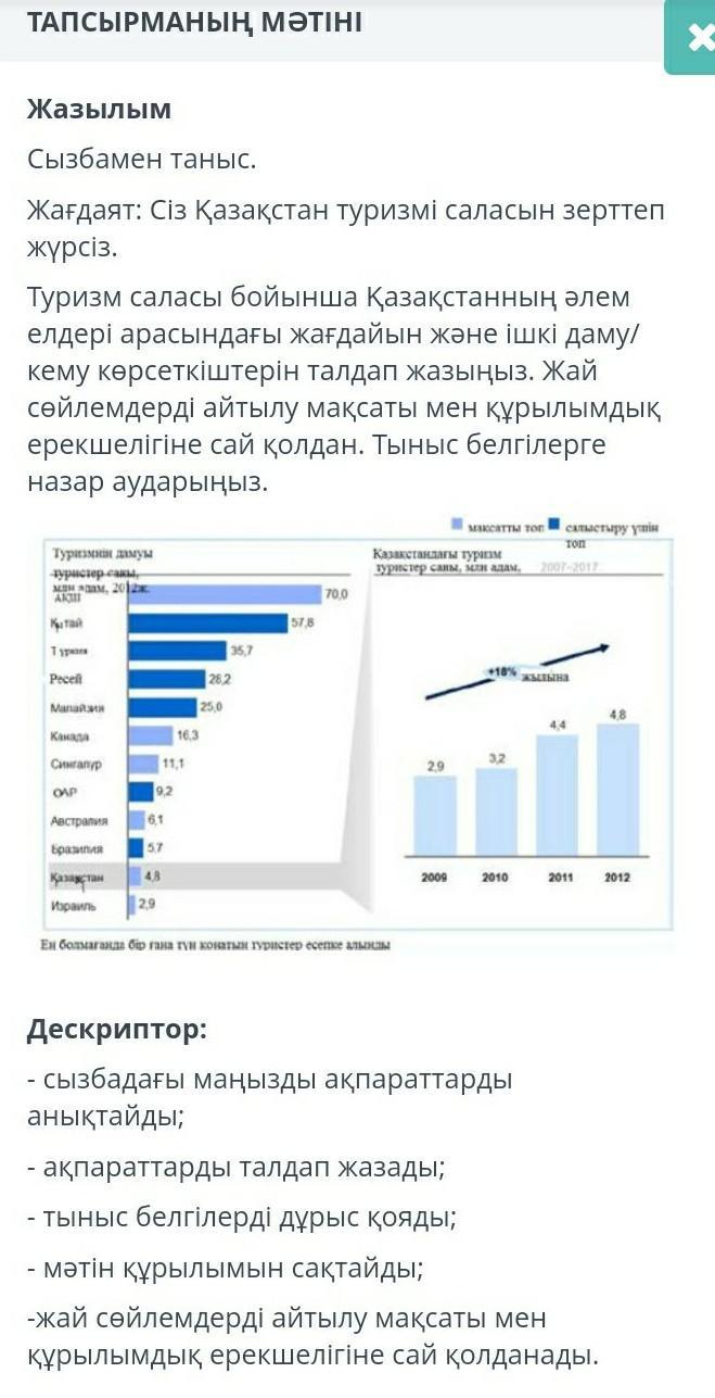 Туризм саласы бойынша Қазақстанның әлем елдері арасындағы жағдайын және ішкі даму/кему көрсеткіштерін талдап жазыңыз. Жай сөйлемдерді айтылу мақсаты мен құрылымдық ерекшелігіне сай қолдан. Тыныс белгілерге назар аударыңыз. Пожалуйста помогите у меня есть только 10 минут помогитее