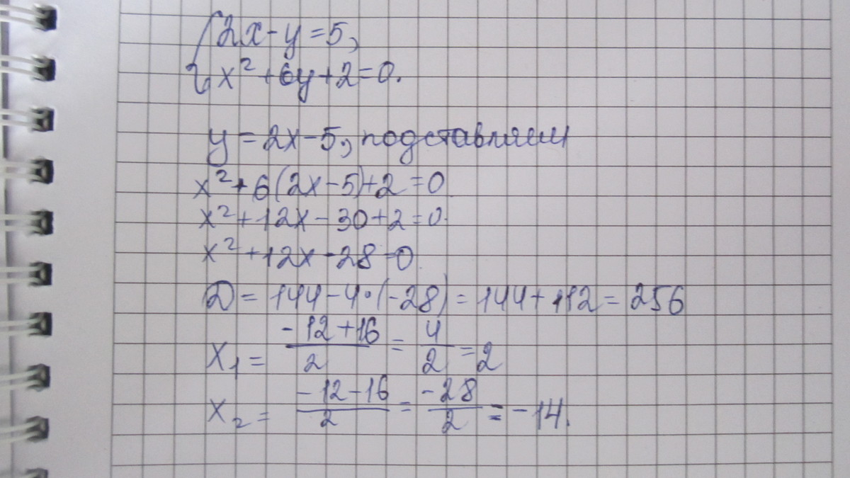 x^2+6y+2=0. x^2+6(2x-5)+2=0. x^2+12x-30+2=0