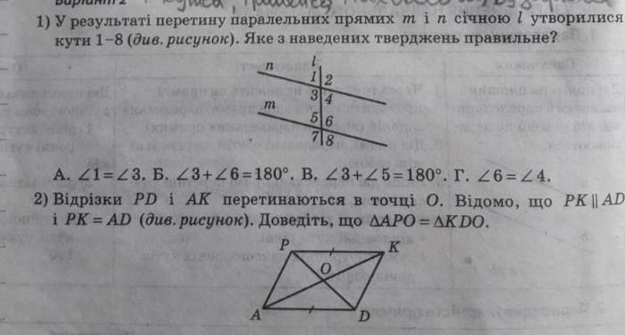 2) Так как PK и AD равны и параллельны, это параллелограмм, значит PA и KD имеет такие же свойства, а диагонали делятся на равные отрезки. Тогда все стороны у двух треугольников по парно равны.