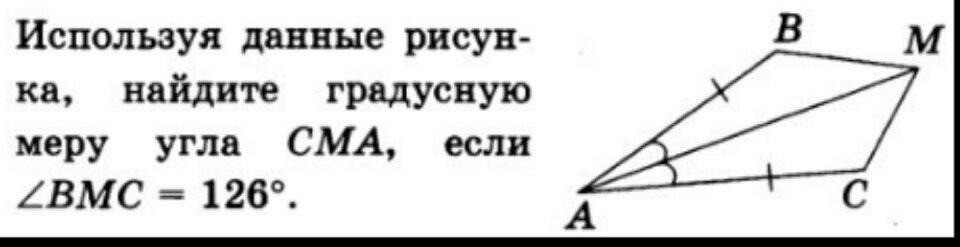 (угол ВАМ=САМ по условию) → угол ВМА=СМА → так что дели свои 126 пополам