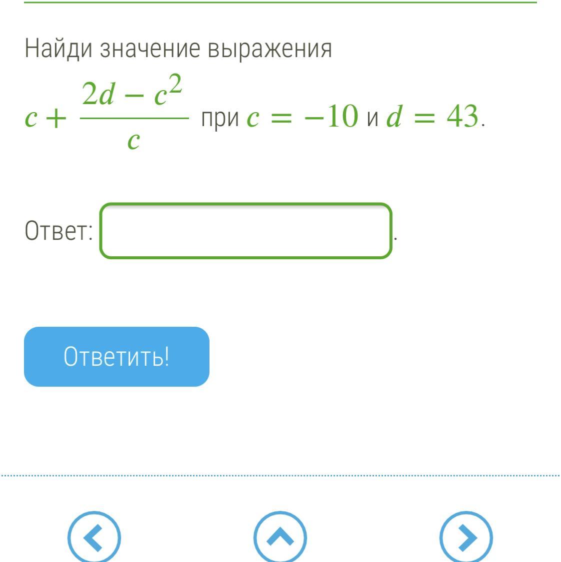 при c=-10 и d=43 выражение c+(2d-c²)÷c принимает значение -8.6.