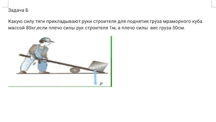Какую силу тяги прикладывают руки строителя для поднятия груза мраморного куба массой 80кг,если плечо силы рук строителя 1м, а плечо силы вес груза 50см.
