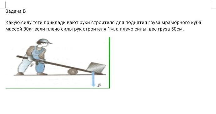 Какую силу тяги прикладывают руки строителя для поднятия груза мраморного куба массой 80кг,если плечо силы рук строителя 1м, а плечо силы вес груза 50см.