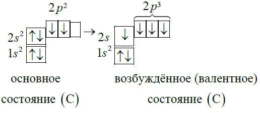 В атоме углерода есть 1 вакантная орбиталь 2p-подуровня. За счет её наличия электроны 2s-подуровня могут распариваться и один из них совершает переход и занимает свободную 2p-орбиталь, т.е. для углерода характерно возбужденное состояние.