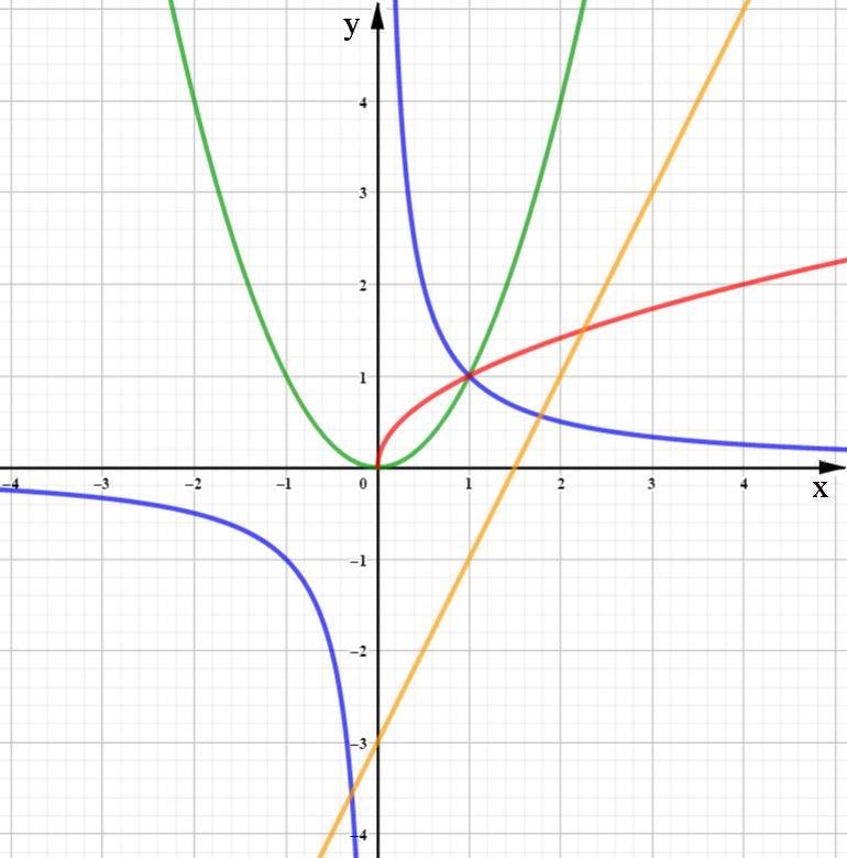 1. Зеленая (парабола). 2. Синяя (гипербола) 3. красная (ветка параболы). 4. желтая (прямая)