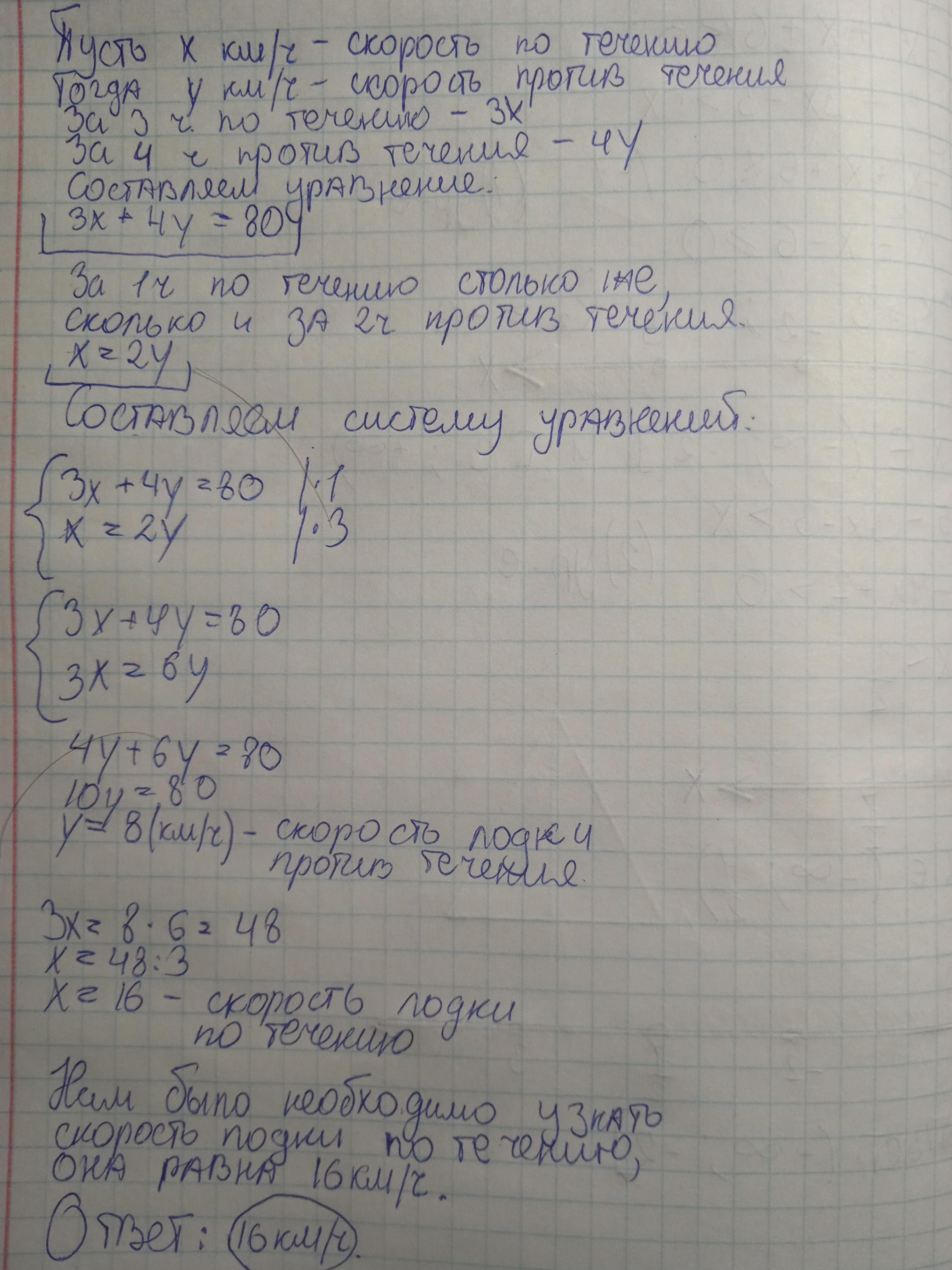 Моторная лодка за 3 ч движения по течению реки и 4 ч против течения проходит 80 км. Найдите скорость лодки по течению и её скорость против течения, если за 2 ч движения против течения она проходит такой же путь, как и за 1 ч по течению.