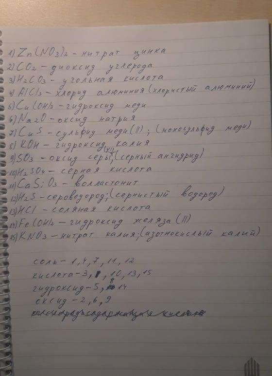Я написал Zn(NO3)2, CO2, H2CO3, AlCl3, Cu(OH)2, Na2O, CuS, KOH, SO3, H2SO4, CaSiO3, H2S, HCl, Fe(OH)2, KNO3 на картинке.