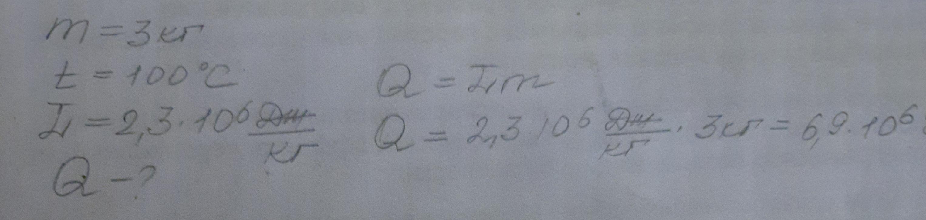 какое колличество теплоты необходимо для превращения в пар 3 кг воды, взятой при температуре 100 °C ( удельная теплота парообразования воды 2.3 *10⁶ Дж/кг) пж срочно