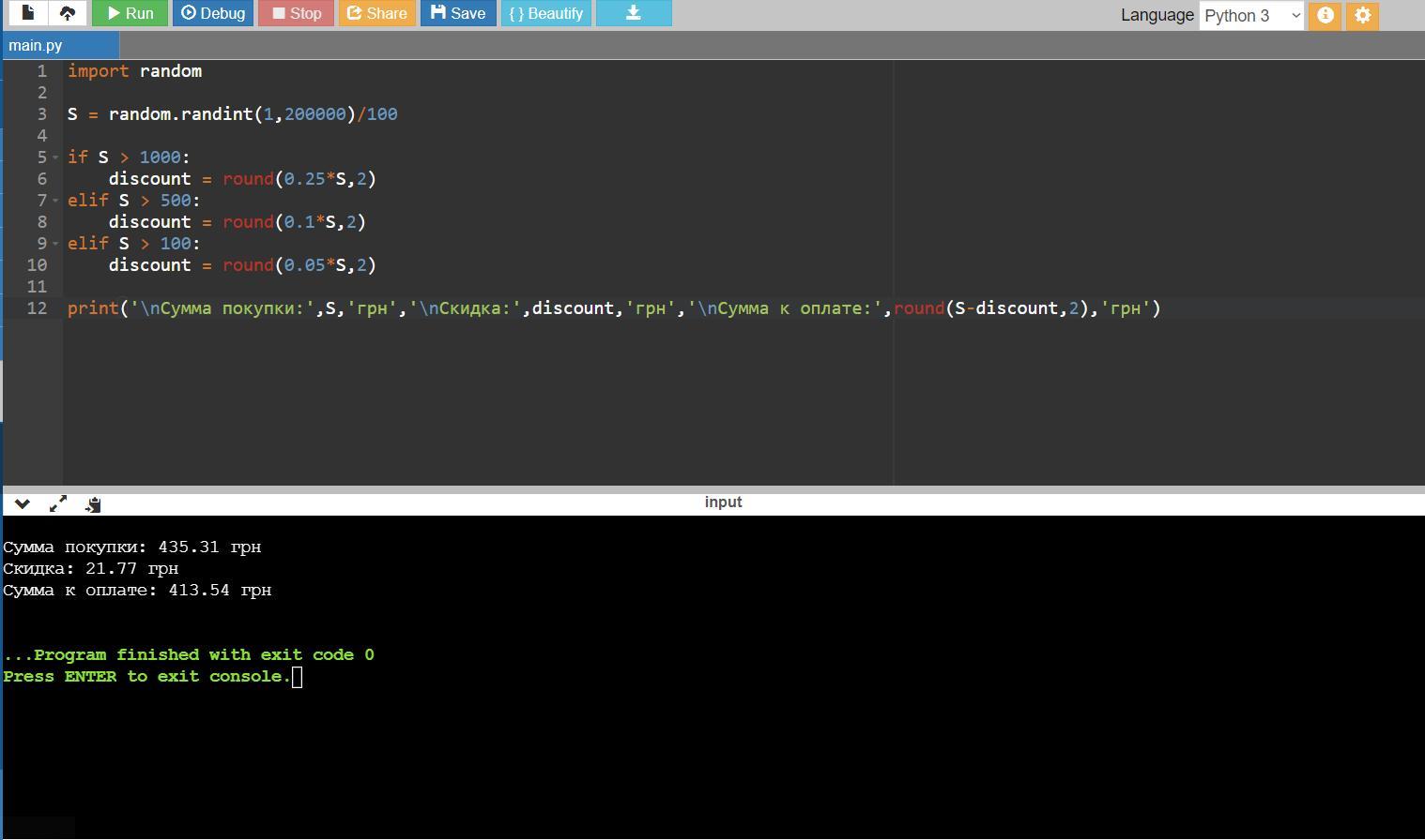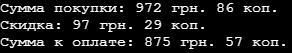 print('\nСумма покупки:',S,'грн','\nСкидка:',discount,'грн','\nСумма к оплате:',round(S-discount,2),'грн')