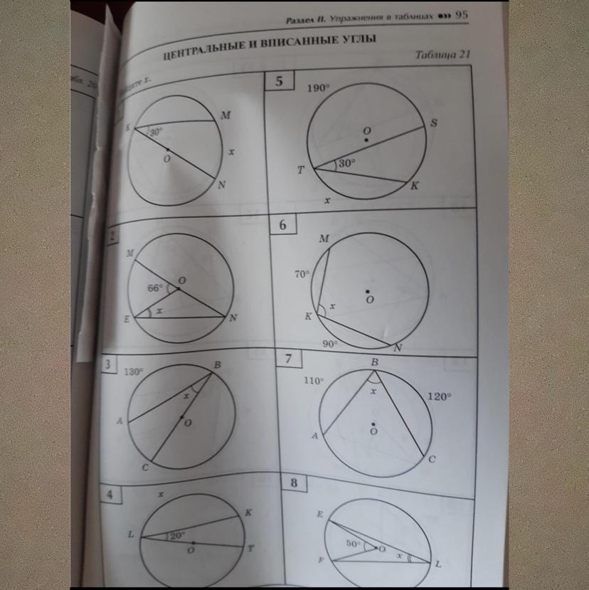 Объяснение:2) угол MKN вписанный тогда так как центральный в раза больше вписанного то центральный угол OMN=2MKN=30*2=60 это и есть угол x =60 гр 4) угол OKT=2OLK=20*2=40 так как OKT центральный угол а OLK вписанный теперь найдем угол x так как x и OKT Образуют угол в 180 то тогда x+OLK=180 => x=140 6) тут нужно знать что центральный угол равен сумме дуг на которые опирается то есть MON=90+70=160 а угол x вписанный то есть x=MON:2=160:2=80 8) тут угол x вписанный а угол 50гр центральный тогда x=50:2=25