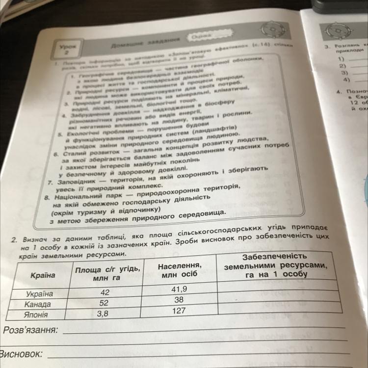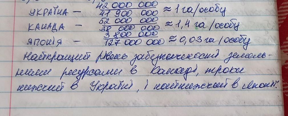 визнач за даними таблиці, яка площа сільськогосподарських угідь припадає на 1 особу в кожній із зазначених країн. Зроби висновок про забезпеченість цих країн земельними ресурсами.