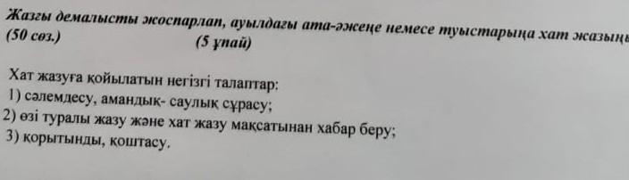 Сәлем әже ата қал-жағдайларыныз қалай?Не жаңалық?Ауылда бәрі тыныш па?Мал басы қалай?Менде бәрі жақсы уайымдамаңыздар.Сіздерді қатты сағындым.Жақында сабағымды бітіргесін сіздерге қарай зулап сағынымшымды басамын.Аман болыңыздар.Сіздердің немерелеріңіз мен.