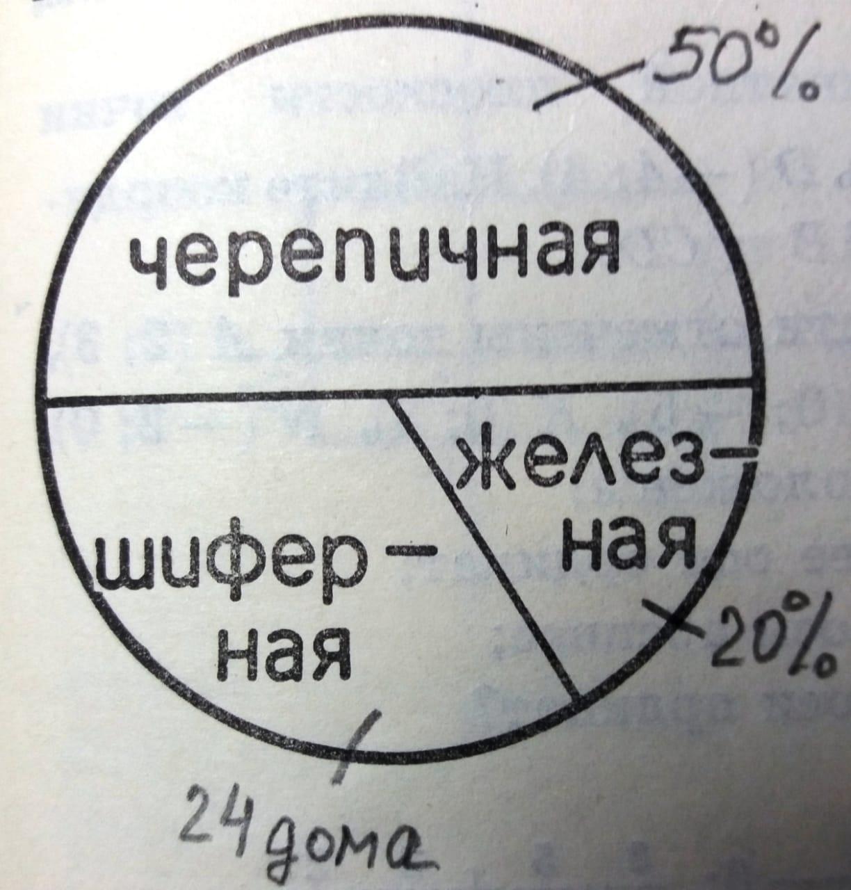 На рисунке 2 дана диаграмма, изображающая количество домов в селе с черепичной, шиферной и железной крышей. Сколько процентов всех домов села с шиферной крышей? Сколько всего домов в селе? Сколько домов с желе