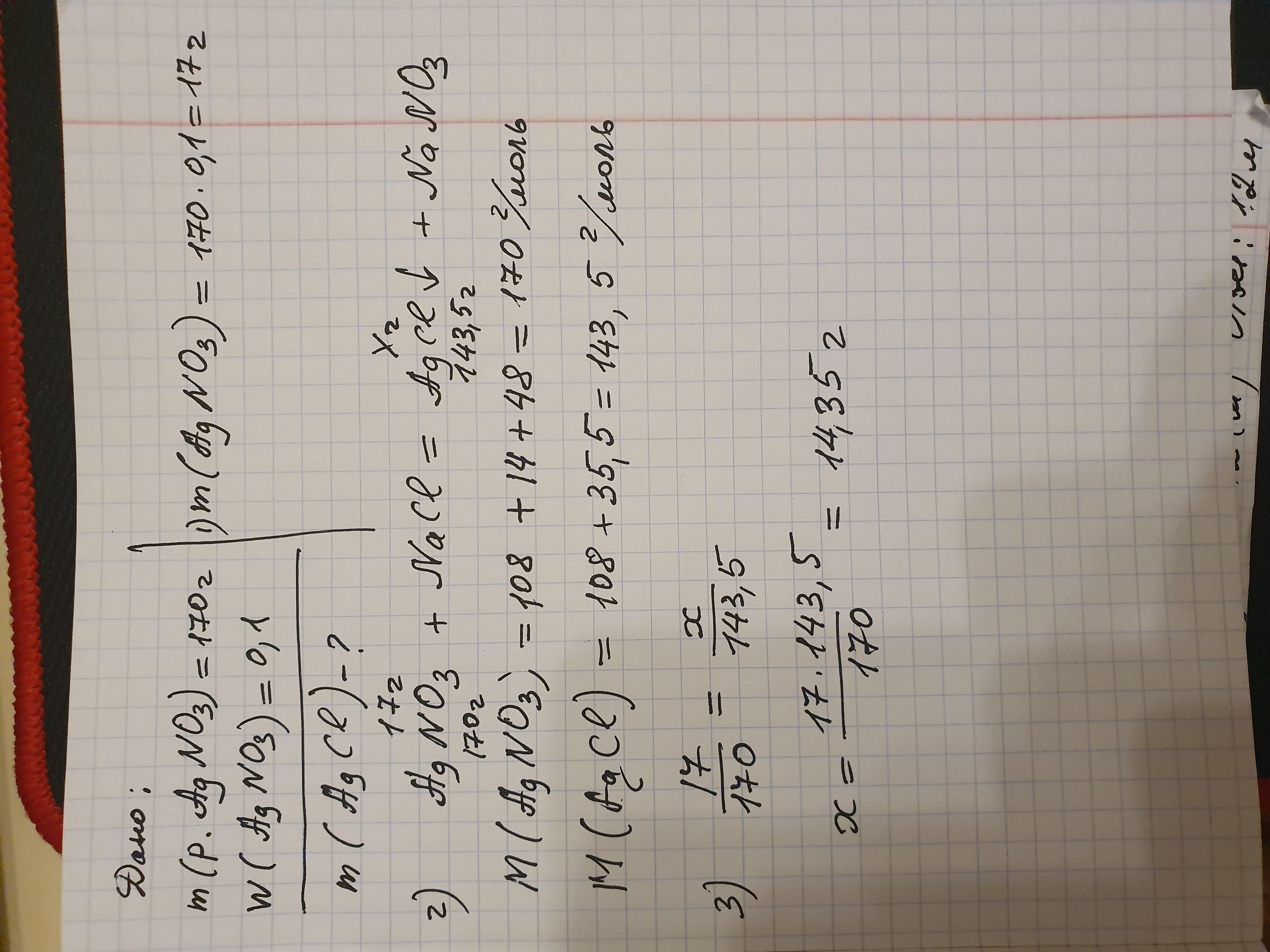 170г раствора нитрата серебра с массовой долей 10% смешали с избытком раствора хлорида натрия. Вычислите массу выпавшего осадка.
