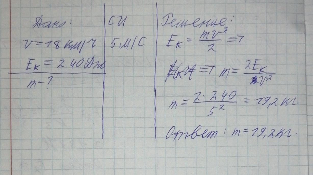 4. Кинетическая энергия птицы, летящей со скоростью 18 км/ч, равна 240 Дж. Определите