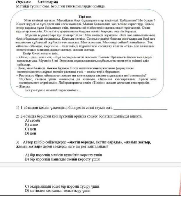 Оқылым 2 - тапсырма Мәтінді түсініп оқы . Берілген тапсырмаларды орында . Тірі көз Мен көзімді аштым . Манайдың бәрі бұлдырап әзер көрінеді . Қадамын ? Не болды ? Кенет жүрегім лүпілдеп жиі соға жөнелді . Маған баданадай көз тесіле қарап тұр . Оның өткір қарасы тұла богыынан өтіп , мидағы ой тізбектерін жатқа окып тұрғандал . Одан құтылар емеспін . Ол өзінің тұнғиығына баурагт әкетіп барады , әкетіп барады . Мүмкін мұның бәрі түс шығар ? Жок ! Мен кезімді жұмдым . Әлгі көз алмылымның бәрін бұлжытпай орындады . Қоркып кеттім . Сонғы күндері болған оқиғалардың бәрі көз алдынан құлындай жүікіп өте шықты . Мен жактын Мен енді сөйлей алмаймын . Тек ойлаған ойымды , көргенім ... білгенімді бұрыштагы согтақтау келген « Тіл » деп аталатын электрондық машина жазып жатыр . жазып жатыр . Қазір Әнес келуге тиіс . -Әлім , – деді кеше ол , - бұл жетпераментті жасама Ғылым Орталыгы баска тәсілдерді карастыруда Мүмкін 8 - ші Эпсилон жұлдызындағы құбылысты шешетін екінші әдіс табылар , – Жок , мен белімді бекем будым . Есеп машинасының жасаған формуласы эксперименттің дұрыс екенін расталы ғой , -дедім теріс бұрылып - Растасың , бірақ ойламаған жерде ми клеткалары закъма ұшыраса не істемексің ? эх , Әнес , ғылым үшін жанымды да қимын . Әңгімен кыскартальақ . Ертең мен эксперимент жүргіземін . Лабораторияға келіп « Тілдің » жазып алғанын тексерерсін - Жақсы Біз үн - түнсіз осылай тарасканбыз ... 1 ) 1 - абзацтан көздің үлкендігін білдіретін сөзді тауып жаз . 2 ) 2 - абзацга берілген көп нүктенің орнына сәйкес болатын шылауды анықта . А ) себебі В ) және С ) мен D ) пен 3 ) Автор кейбір сөйлемдерде « әкетіп барады , әкетіп барады » , « жазып жатыр , жазып жатыр » деген сөздерді неге екі рет қайталайды ? А ) бір нәрсенің мәнісін күшейтіп көрсету үшін В ) бір нәрсенің маңызды екенін көрсету үшін C ) оқырманның есіне бір нәрсені түсіру үшін D ) мәтіндегі сөз санын толықтыру үшін 4 ) Мәтіндегі қарамен берілген сөздің мағынасын түсіндіріп жаз . 5 ) Мәтіннің мазмұны бойынша шешім табуға бағытталған бір сұрақ құрастыр және оған жауап жаз . Сұрақ Жауап