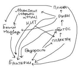 Нарисуйте пищевую сеть Северного Ледовитого океана, состоящую не менее, чем из 10 организмов. В сети должны быть представлены производители, потребители, разрушители, причем производители – внизу листа. Стрелки должны быть направлены к тому организму, к которому переходят вещество и энергия. Стрелки не должны пересекаться.