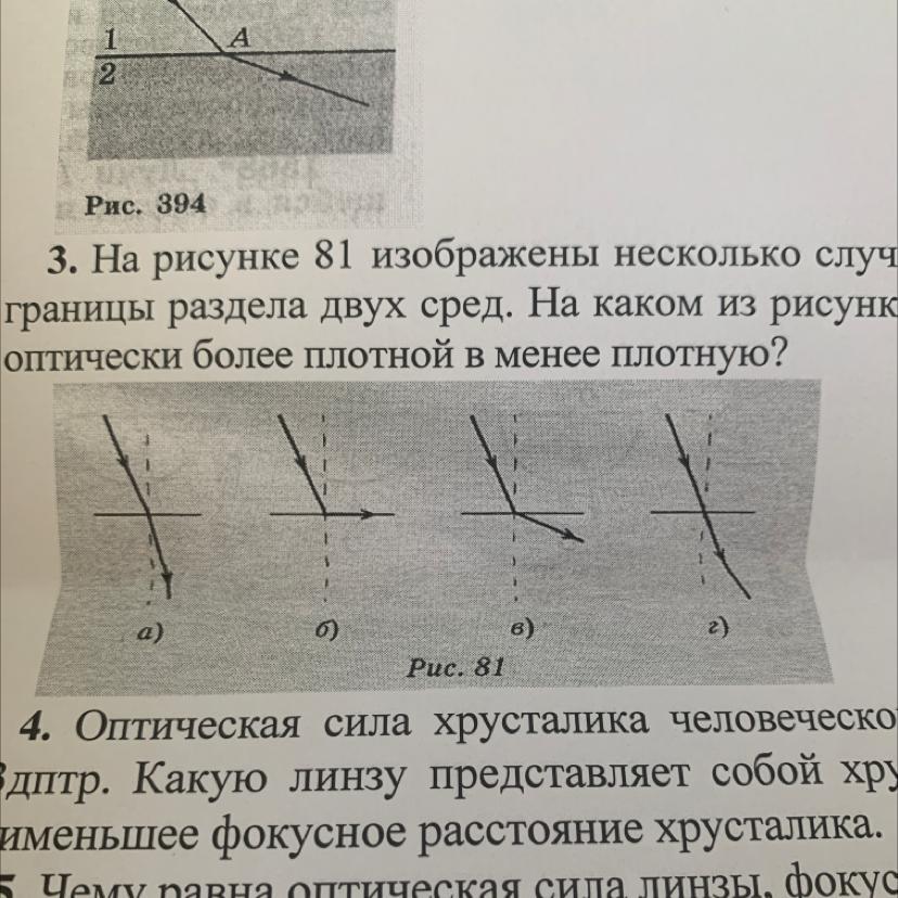 на рисунке 81 изображены несколько случаев хода луча после прохождения границы раздела двух сред На каком из рисунков показан переход луча из среды оптически более плотной в менее плотную