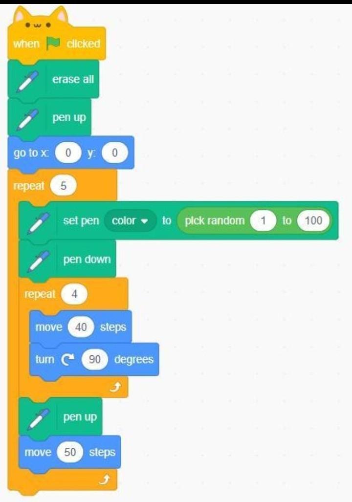 1)Створіть проект виконавець малює 10 квадратів різних кольорів (сторонн квадратів по 50 кроків, квадрати розміщені по колу).