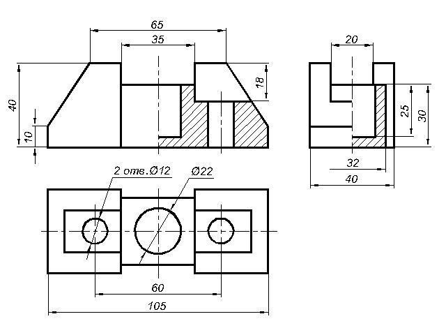 Для детали, заданной двумя проекциями, вычертить недостающий вид, применить необходимые разрезы, нанести штриховку, нанести размеры