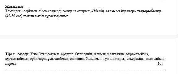 Менің атам ардагер.Атам Ұлы Отан соғысында отан үшін күресті. Бұның бәрі жеңіспен аяқталды. Мен отбасымен жыл сайын ардагерлерге гүл шоқтарын беріп құттықтаймыз және құрметтейміз ескерткіштерге барудыда ұмытпаймыз. Менің бар тілегім ешқашан соғыс болмасын. Біз әрдайым ардагерлерді құрметтеуіміз қажет себебі олар біздің болашағымыз үшін күресті.