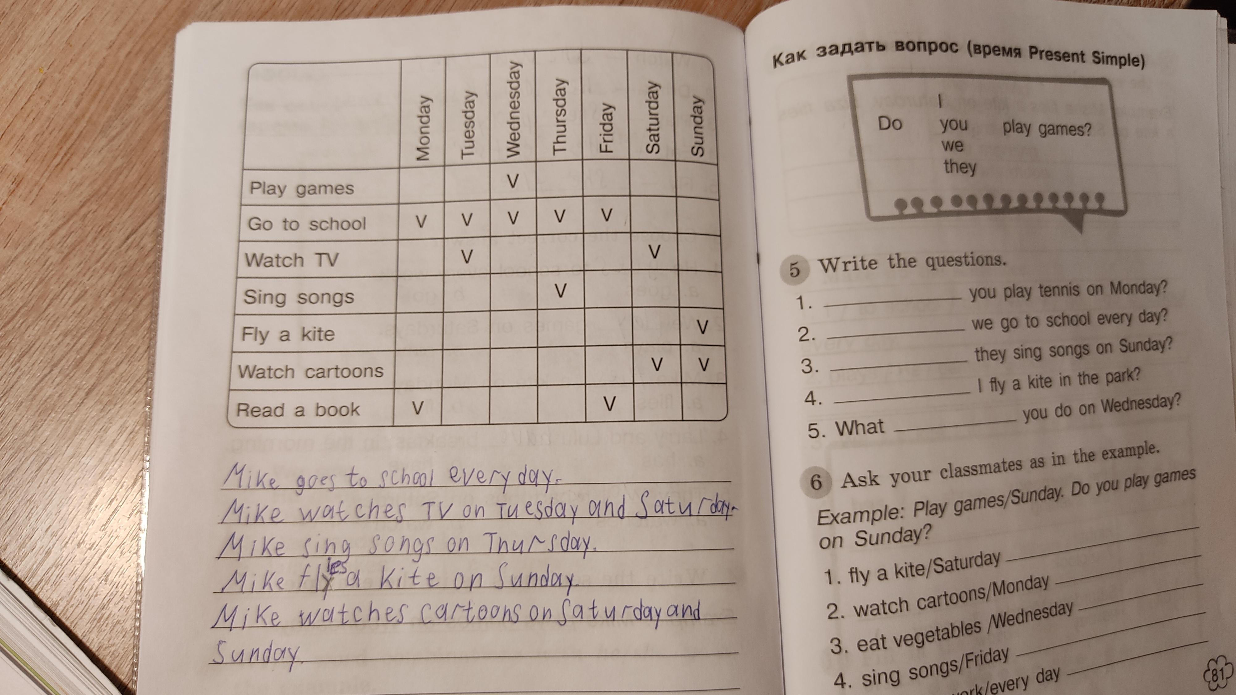 Добрый вечер, Помогите пожалуйста.Правильно ли мы написали предложения и ещё в 5 номере надо везде написать What do?
