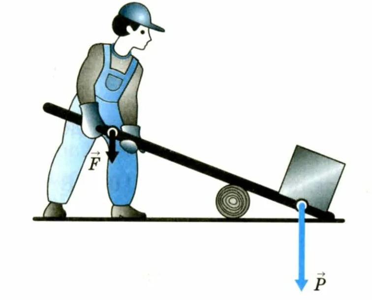 Это действие рычага. Работник опускает вниз с силой(F) и вес(P) груза направлен к центру.