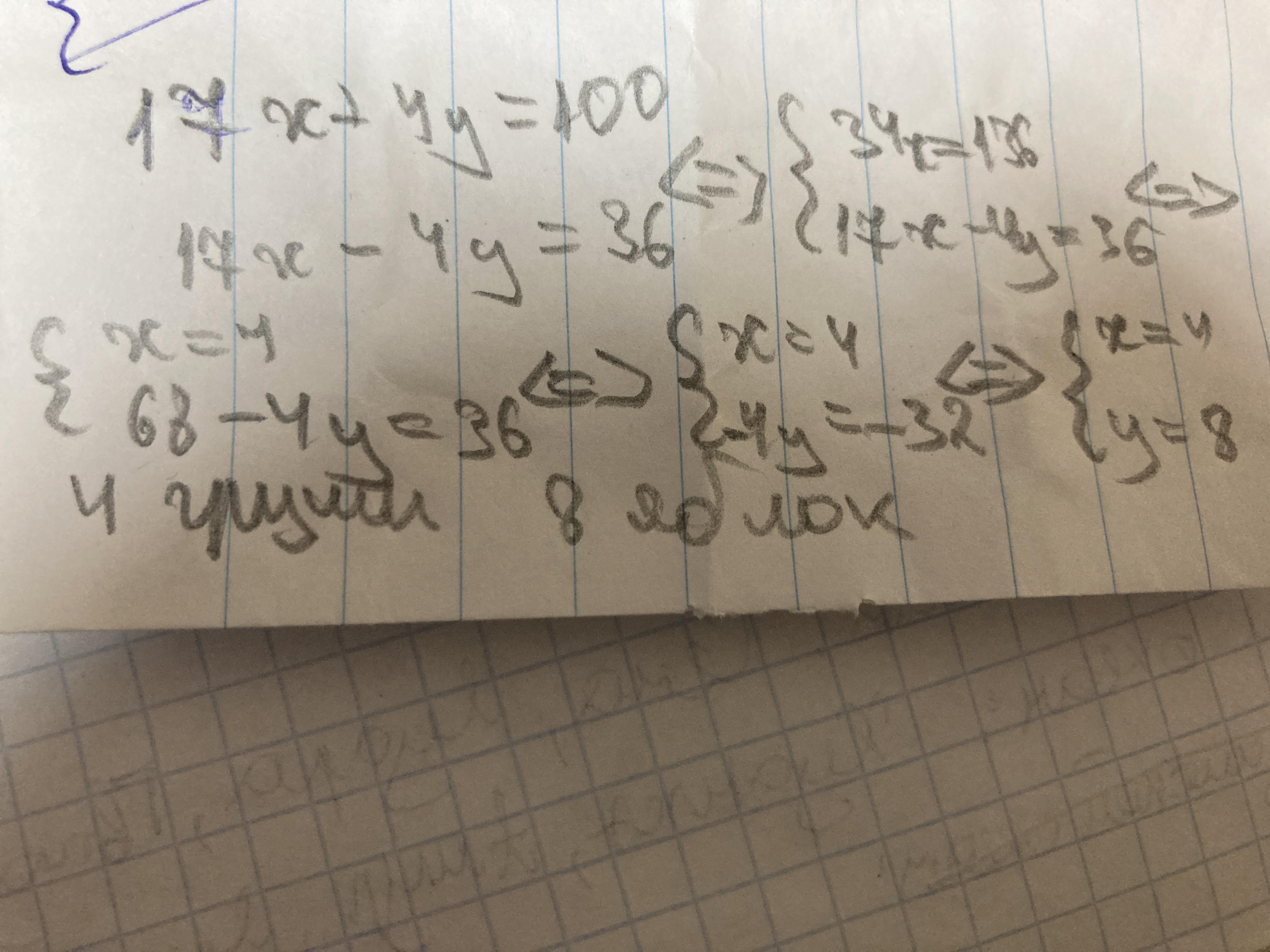 Груша стоит 17 рублей, а яблоко 4 рубля, Петя купил несколько груш и яблок, заплатив за всю покупку 100 рублей. Сколько груш и сколько яблок купил Петя, если за груши он заплатил на 36 рублей. больше, чем за яблоки?ъ