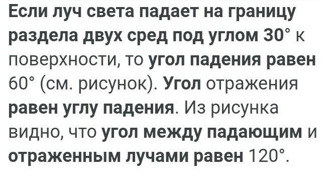 Луч света падает на границу раздела двух сред под углом 30 ° Чему равен угол падения, если угол между падающим лучом и отраженным составляет