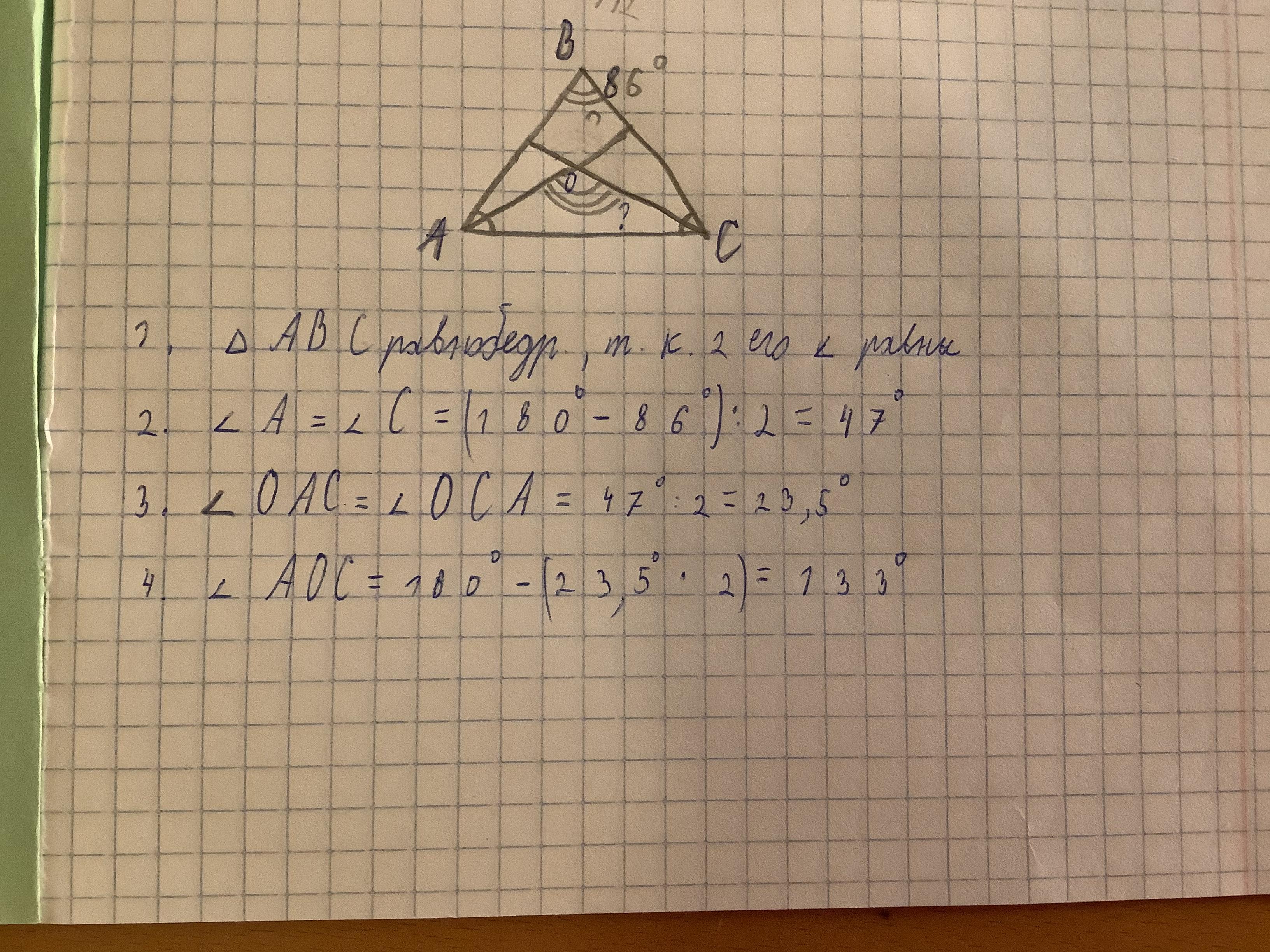 Произвольный треугольник имеет два равных угла. Третий угол в этом треугольнике равен 86°. Из равных
