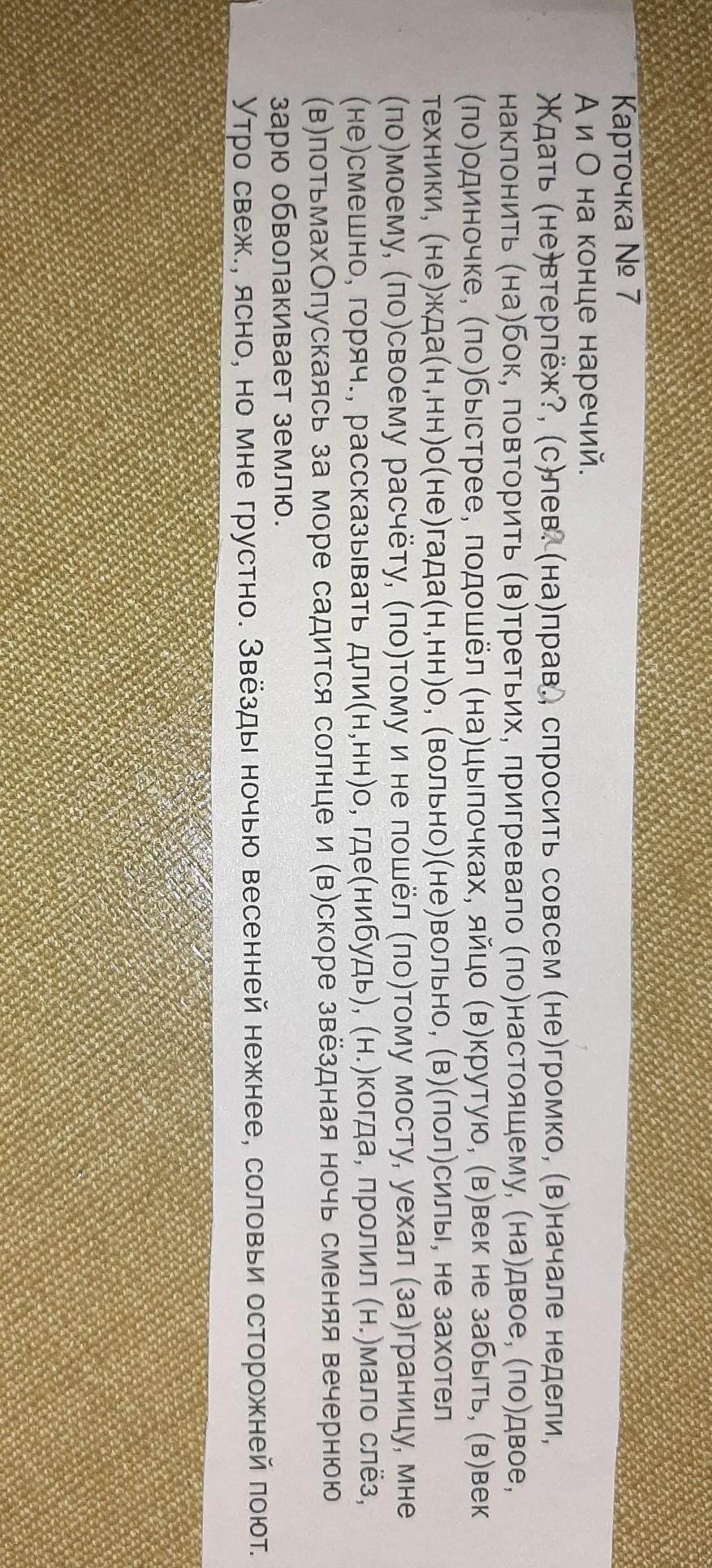 Ждать невтерпёж, слева направо, спросить совсем негромко, в начале недели, наклонить набок, повторить в-третьих, пригревало по-настоящему, надвое, по двое, поодиночке, побыстрее, подошёл на цыпочках, яйцо вкрутую, ввек не забыть, в век техники, нежданно-негаданно, вольно невольно, вполсилы, не захотел по-моему, по своему расчёту, потому и не пошёл по тому мосту, уехал заграницу, мне несмешно, горячо, рассказывать длинно, где-нибудь, некогда (никогда), пролил немало слёз, впотьмах. Опускаясь за море, садится солнце, и вскоре звёздная ночь, сменяя вечернюю зарю, обволакивает землю.