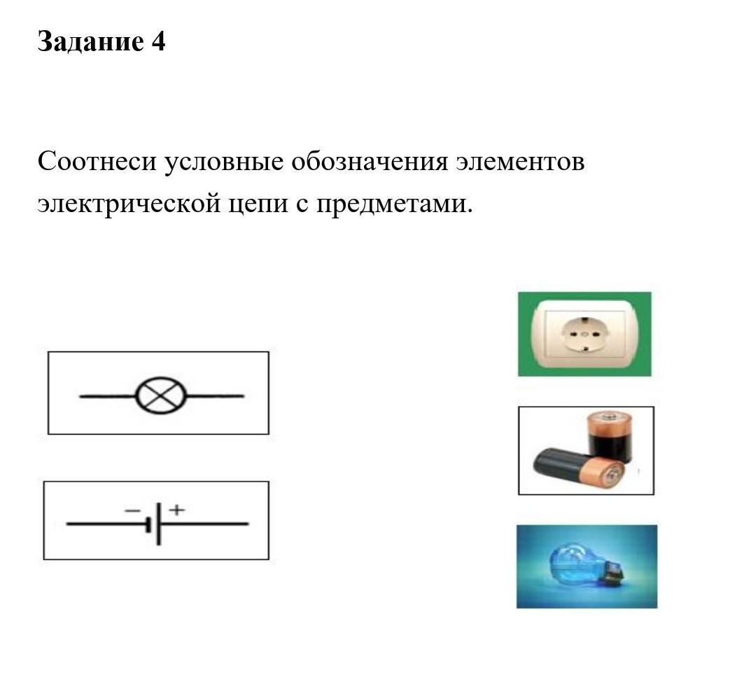 Соотнеси условные обозначения элементов электрической цепи с предметами.