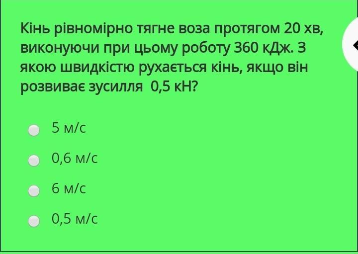 Лошадь равномерно тянет воз в течение 20 мин, Делая при этом работу 360 кДж. С какой скоростью движется лошадь, если он развивает усилие 0,5 кН?