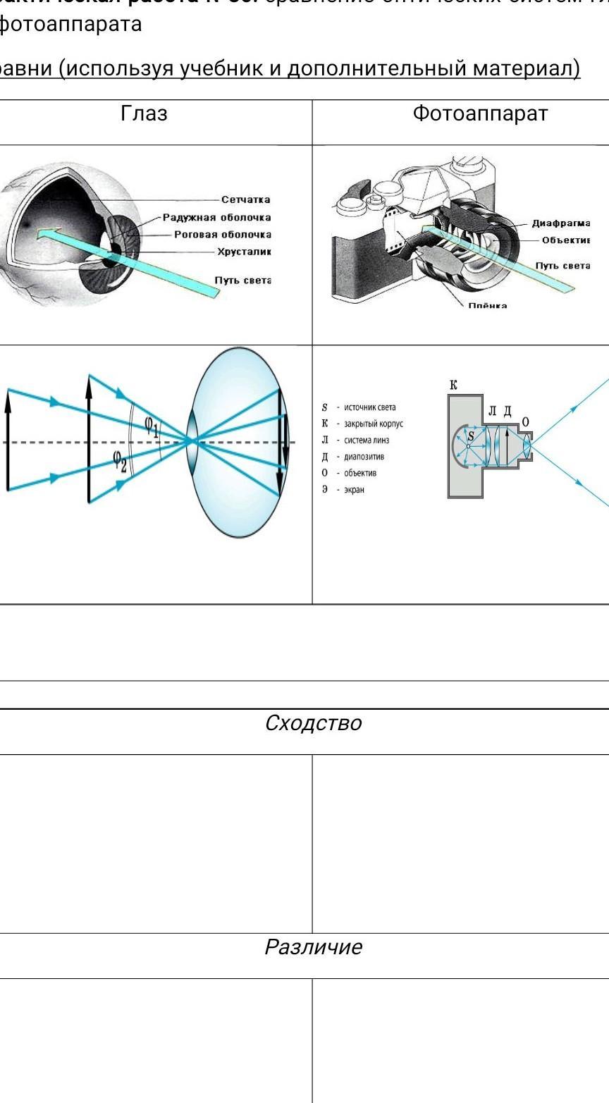 В фотоаппарате изображение проецируется на матрицу (или фотоплёнку), а глазе изображение проецируется на сетчатку. В глазе есть хрусталик, который мышцами может деформироваться, а в фотоаппарате имеется линза и настройка резкости