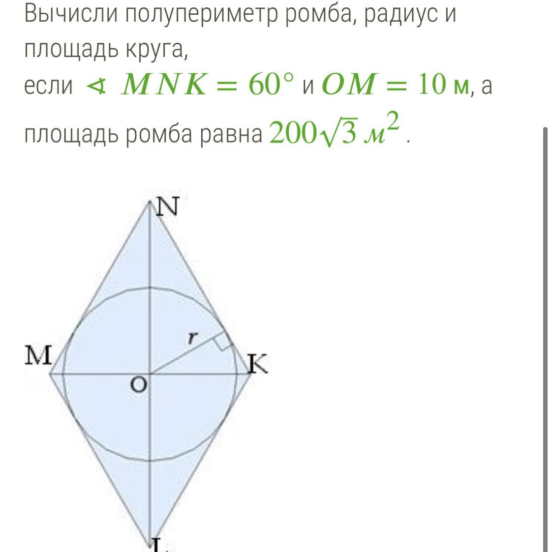 периметр ромба Р=4а, полупериметр р=2а=2*20м=40м.