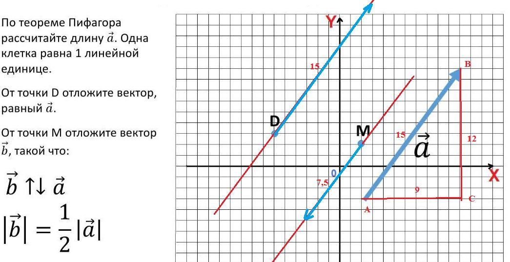 3. Вектор b по условию имеет длину в 2 раза меньшую, чем вектор а и противонаправлен вектору а.Следовательно, через точку М проводим прямую параллельную вектору а и от точки М откладываем вектор, имеющий длину 7,5 и направленный против вектора а.