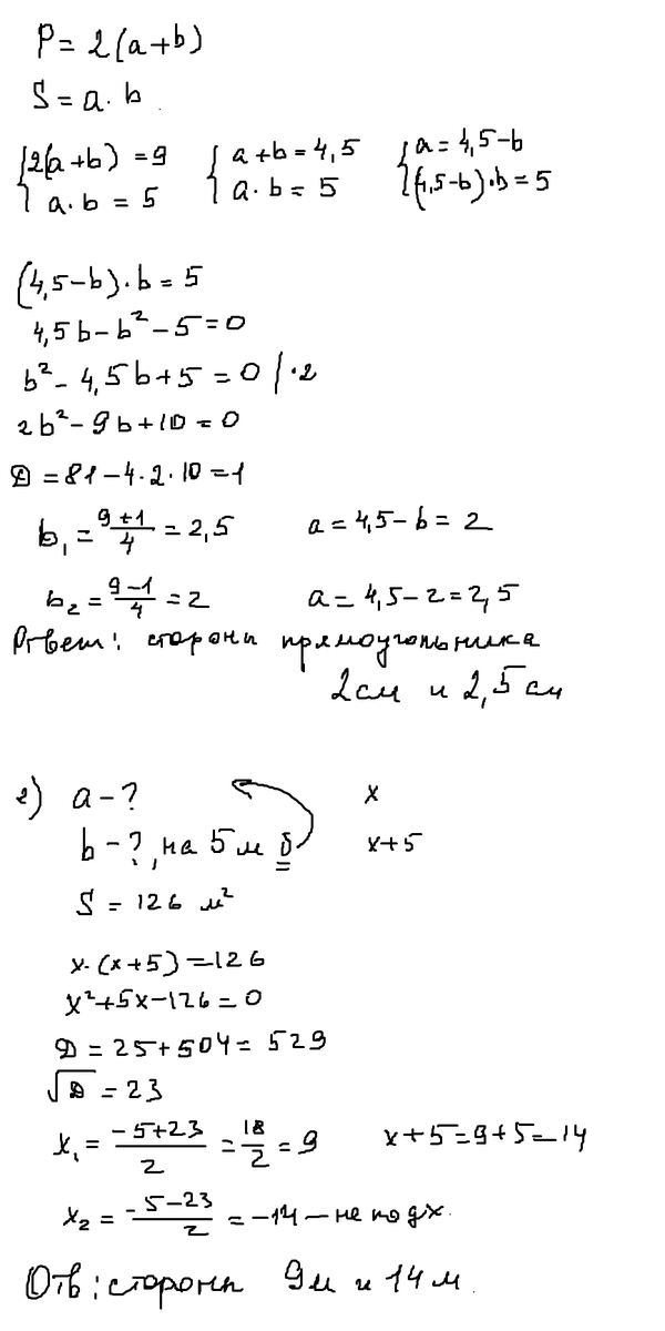 2: Одна сторона прямоугольника на 5 м больше другой, а его площадь равна 126 м квадрате. Найдите стороны прямоугольника?