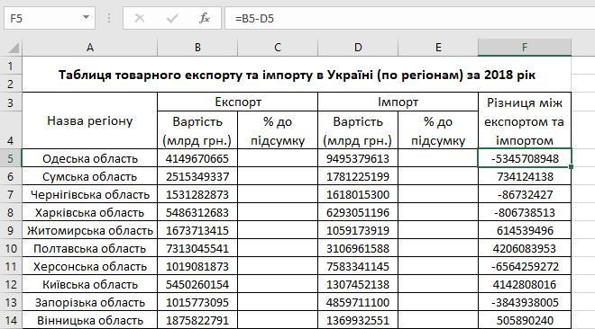 правильно ли я сделал подсчет разницы между экспортом/импортом (=B5-D5 и тд)