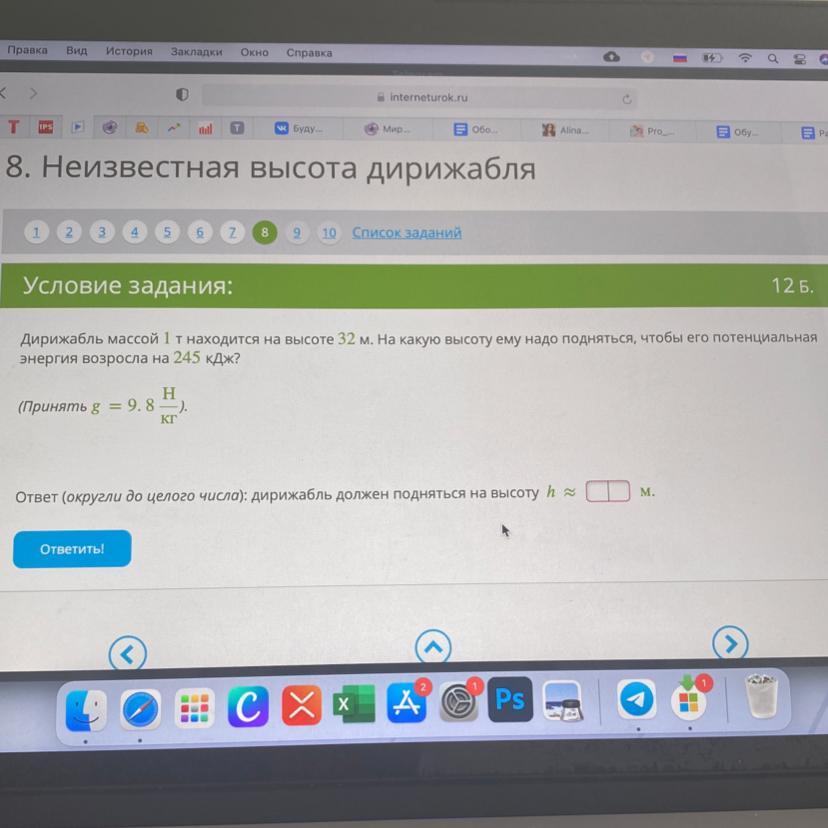 Дирижабль массой 1т находится на высоте 32 м. На какую высоту ему надо подняться, чтобы его потенциальная